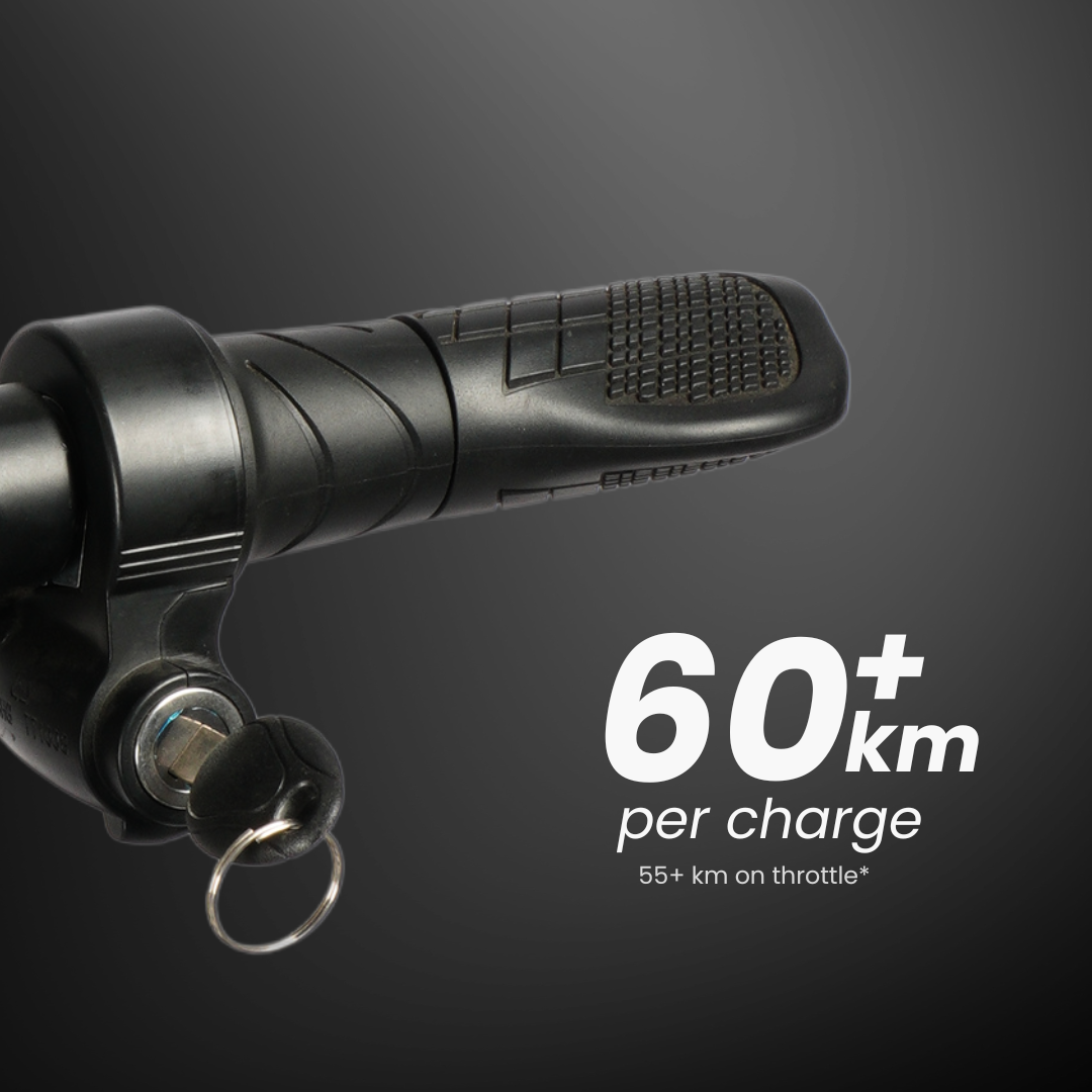• 60 km range* on pedal assist, with 45 kms on throttle